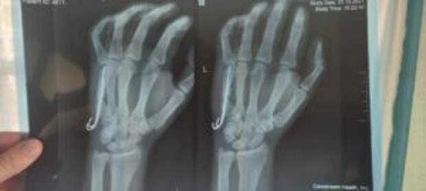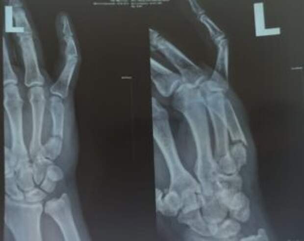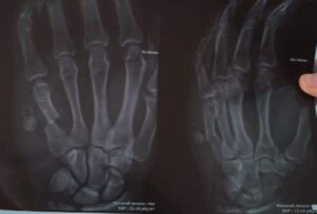 Diagnose: Schussfraktur des fünften Mittelhandknochens mit Dislokation. Es entstand ein falsches Gelenk, eine Operation ist erforderlich.