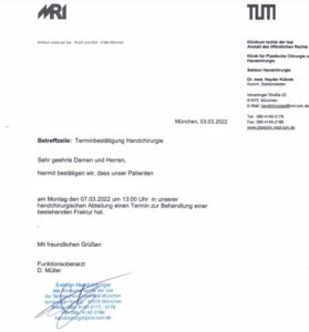 Am Montag, dem 07.03.22, kommt der erste Verletzte zur Behandlung in München an. Hier ist eine Zusammenfassung des Patienten: Diagnose: Schussfraktur des fünften Mittelhandknochens mit Dislokation. Es entstand ein falsches Gelenk, eine Operation ist erforderlich. Aufnehmendes Krankenhaus: Universitätsklinikum Rechts der Isar.